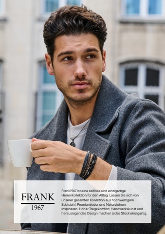 Frank1967 ist eine zeitlose und einzigartige Herrenkollektion f%u00fcr den Alltag. Lassen Sie sich von unserer gesamten Kollektion aus hochwertigem Edelstahl, Premiumleder und Natursteinen inspirieren. Hoher Tragekomfort, Handwerkskunst und herausragendes Design machen jedes St%u00fcck einzigartig.
